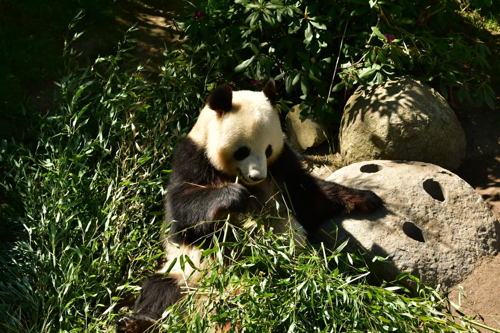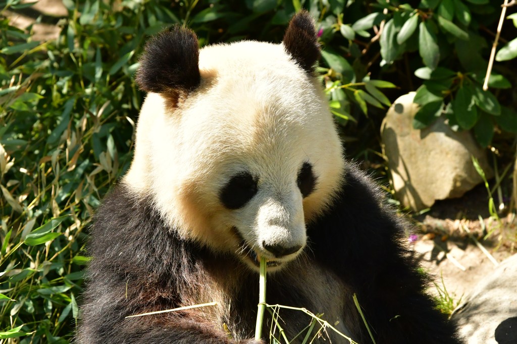 The giant panda (Ailuropoda melanoleuca), also known as the panda bear or simply panda, is a bear species endemic to China. It is characterised by its white coat with black patches around the eyes, ears, legs and shoulders. Its body is rotund; adult individuals weigh 100 to 115 kg (220 to 254 lb) and are typically 1.2 to 1.9 m (3 ft 11 in to 6 ft 3 in) long. It is sexually dimorphic, with males being typically 10 to 20% larger than females. A thumb is visible on its forepaw, which helps in holding bamboo in place for feeding. It has large molar teeth and expanded temporal fossa to meet its dietary requirements. It can digest starch and is mostly herbivorous with a diet consisting almost entirely of bamboo and bamboo shoots.