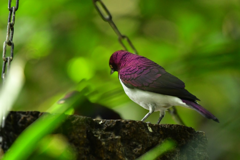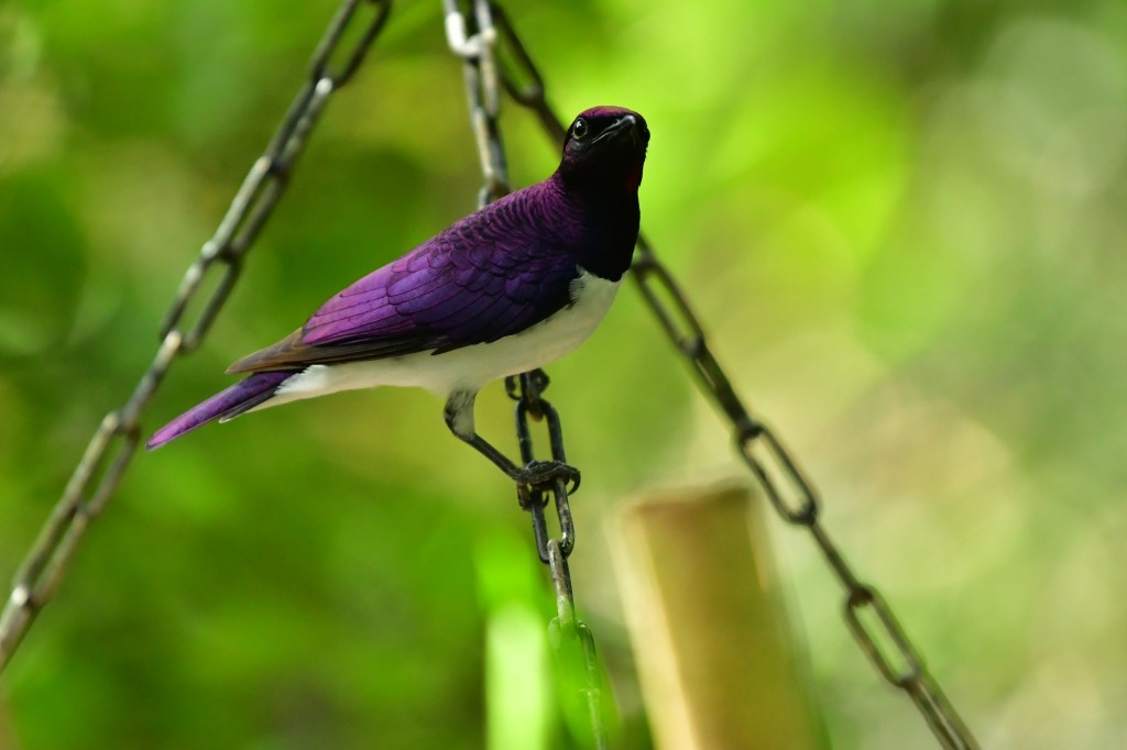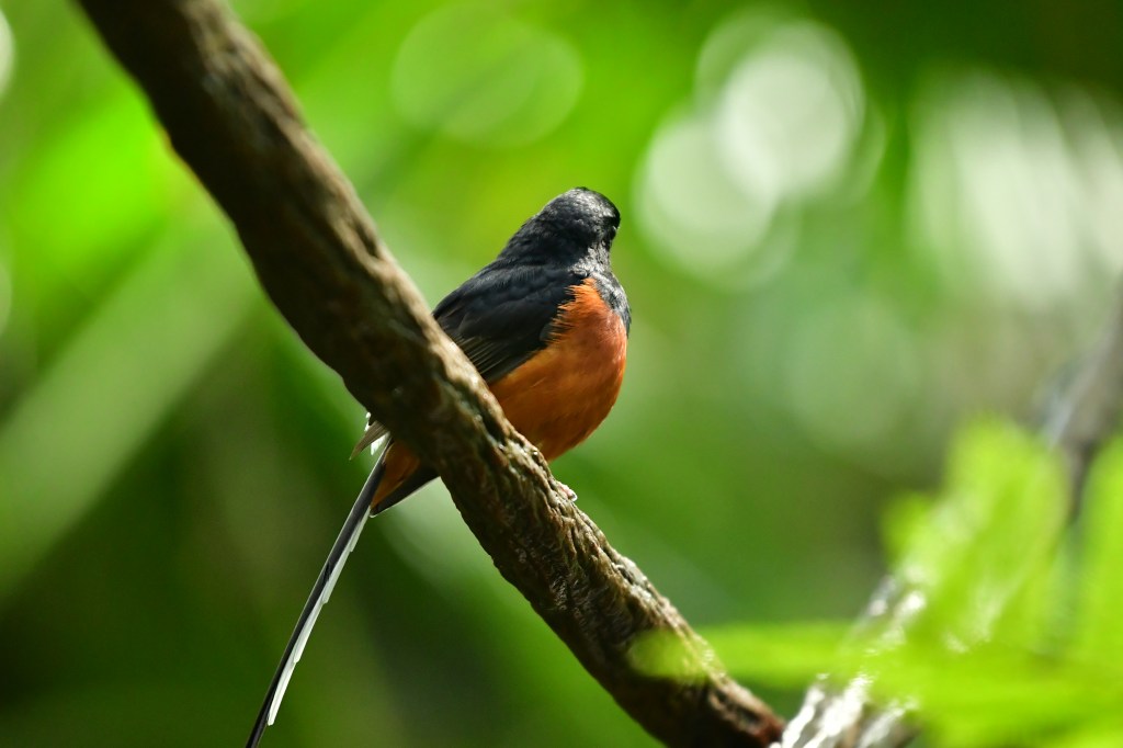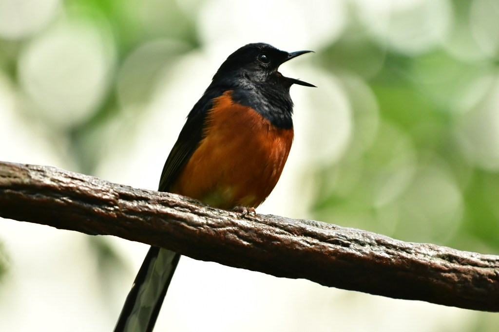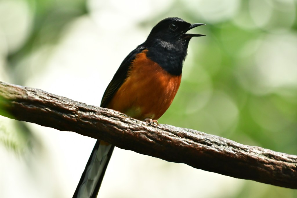 The White-rumped Shama is a songbird native to South and Southeast Asia. They are known for their melodious and varied songs. Males are particularly vocal during the breeding season to attract females and establish territory. These birds prefer dense undergrowth in forests and are often kept as cage birds due to their singing ability.