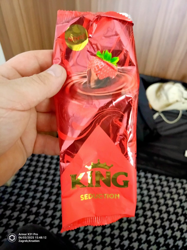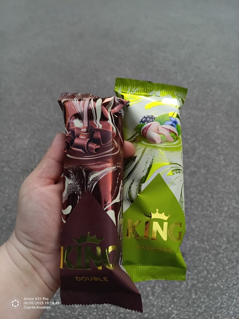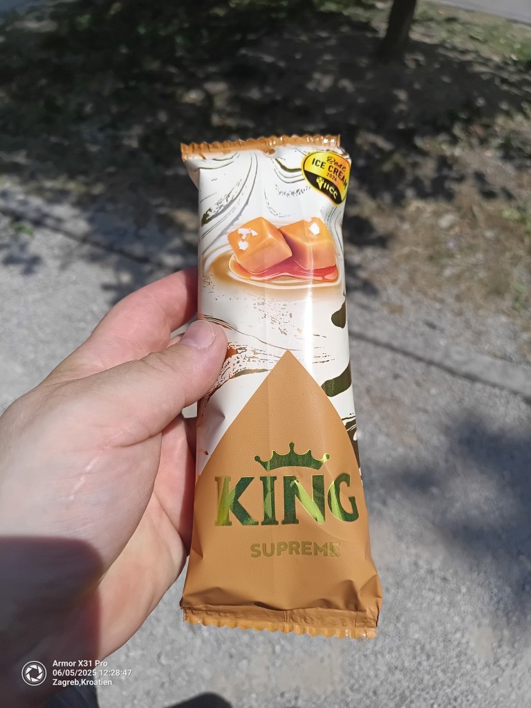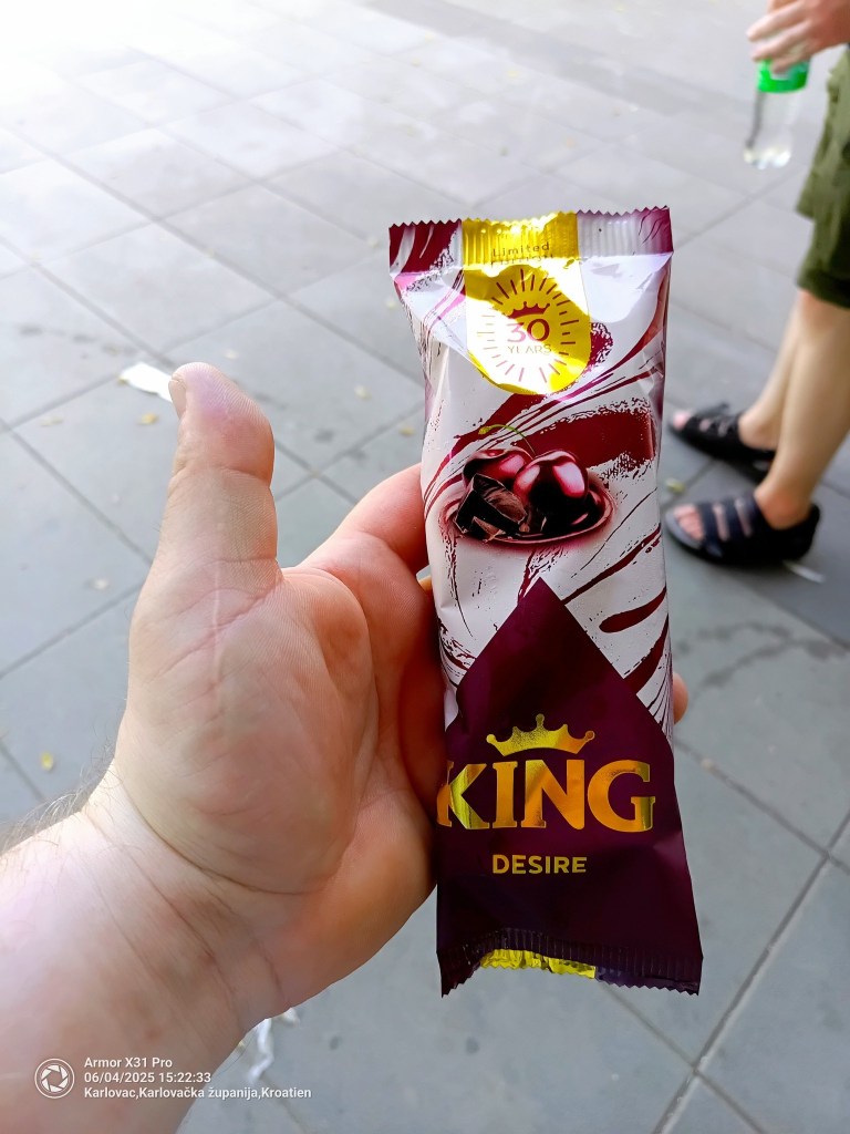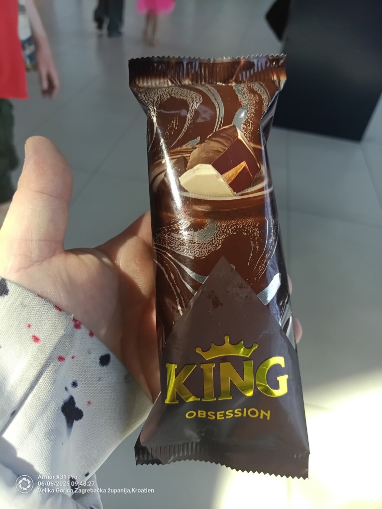 With time to spare, I finally managed to track down King Obsession, the last in the King ice cream series I hadn’t tried (besides the elusive “King Classic 30% manje šećera”—with 30% less sugar—which I never did find in stock). This whole trip, I’d basically made it my side-quest to try every King ice cream variant Croatia had to offer, and the airport was my last chance.